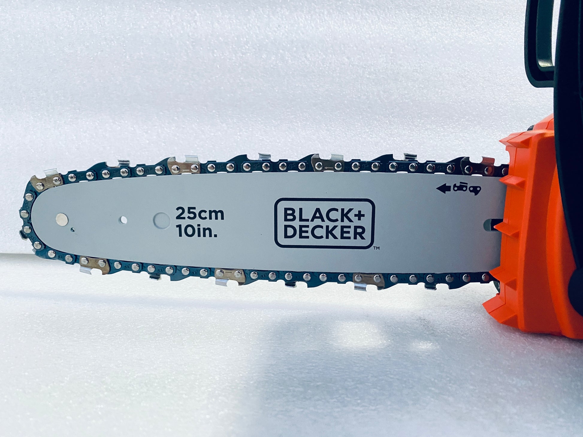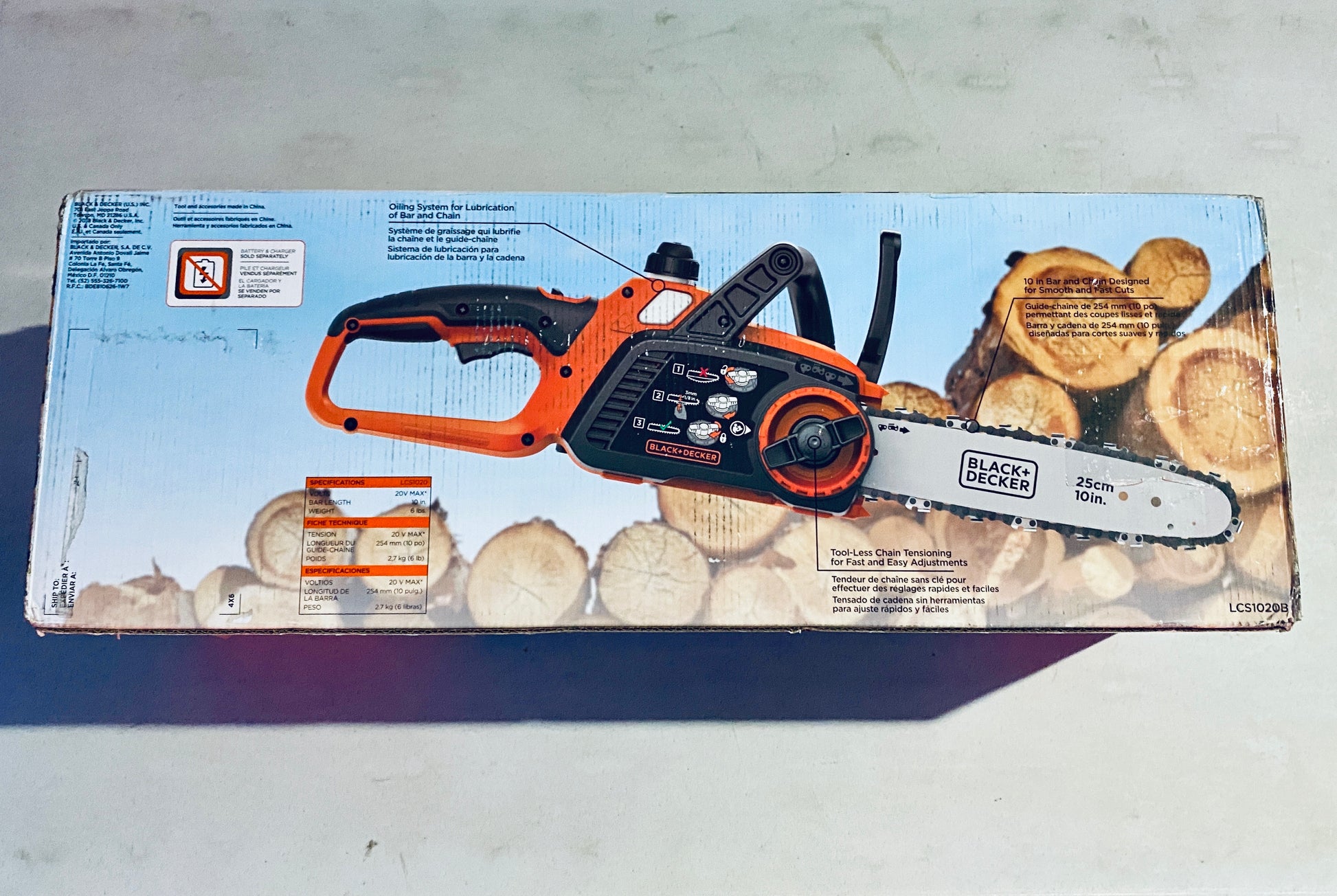 The BLACK+DECKER LCS1020B Cordless Chainsaw is ideal for pruning standing branches and cutting fallen branches up to 10 in. thick. It features a 10 in. Oregon low-kickback bar and chain for smooth, fast cuts. The tool-free tensioning system allows quick and easy adjustment of the chain's tautness for optimal cutting performance.