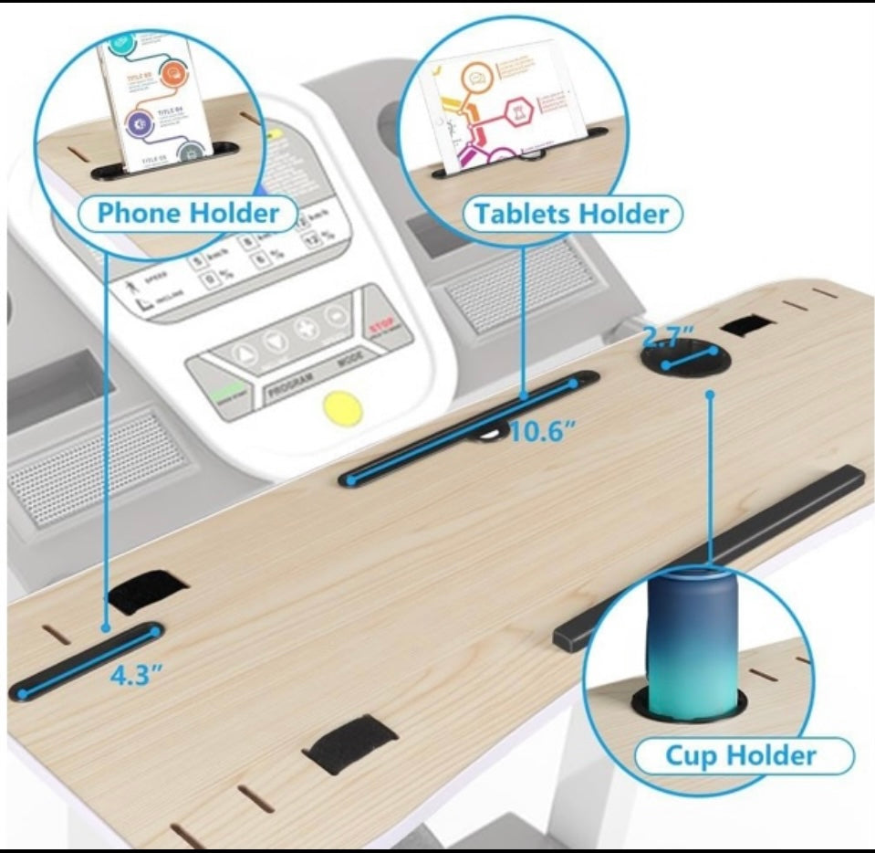 - Work While Walk: An edge protective guard of universal treadmill desktop protects your laptop from falling. Equipped with slots to hold phones, tablets, laptops, and cups, protect items from slipping. The edge rubber protects your items from scuffs and scratches.